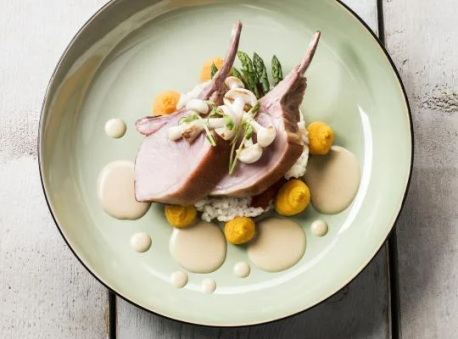 Speenvarken rack met Champignonsaus, groene asperges en Bombarijst